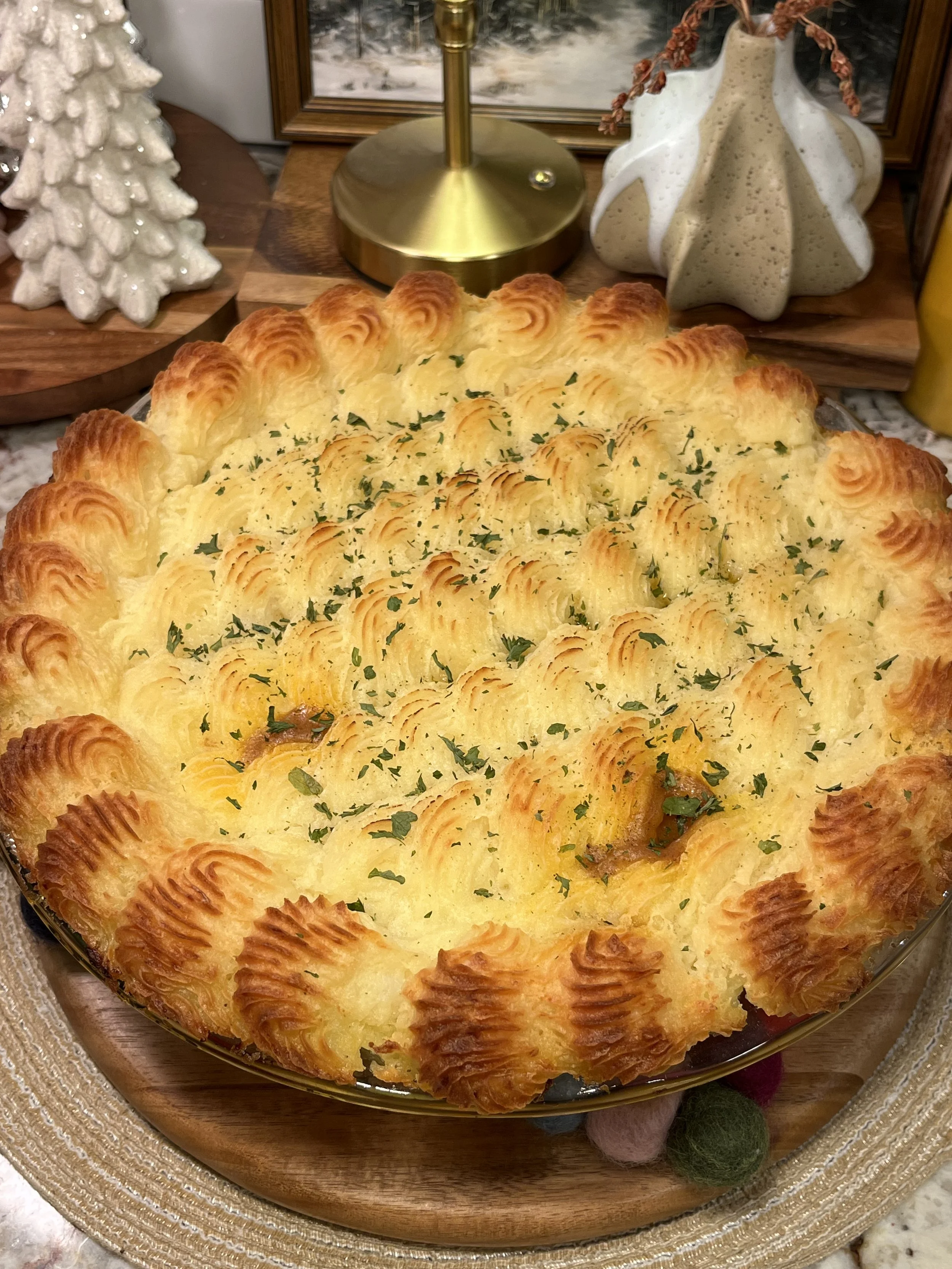Place the mashed potatoes in a piping bag fitted with a star tip. Pipe the mashed potatoes on top in a decorative design or dump the potatoes on top and smooth it out flat and/or make a rustic design.