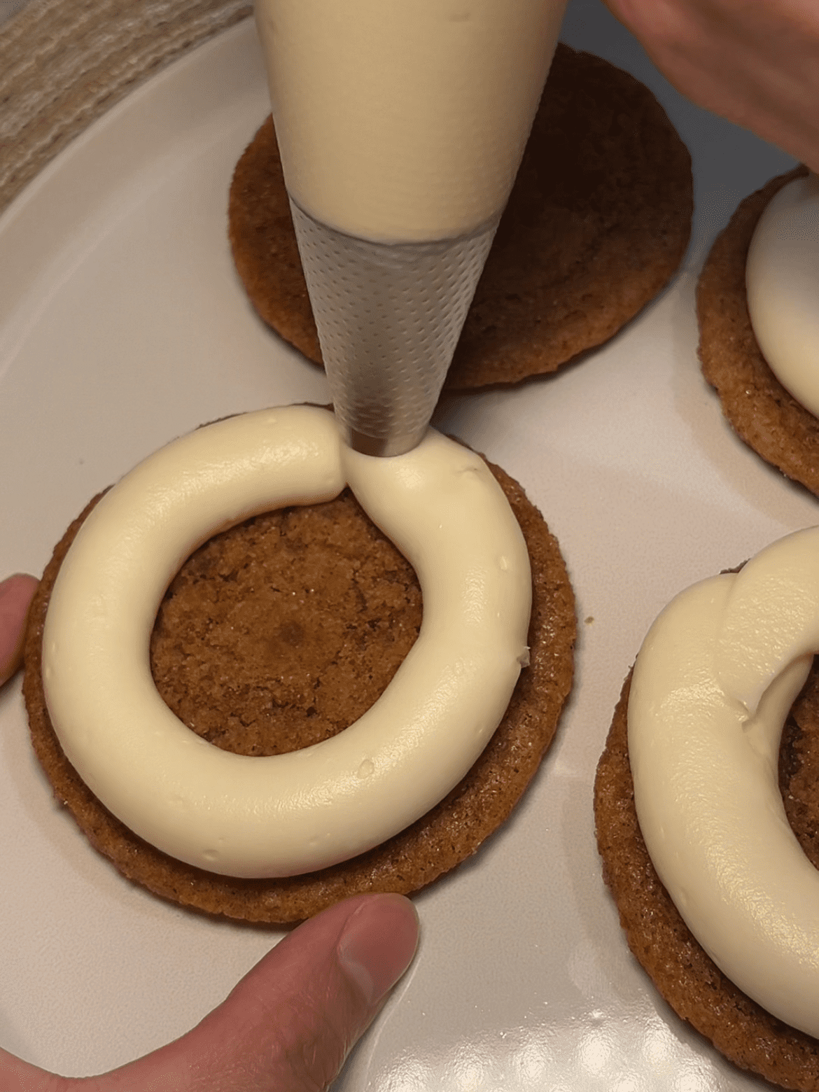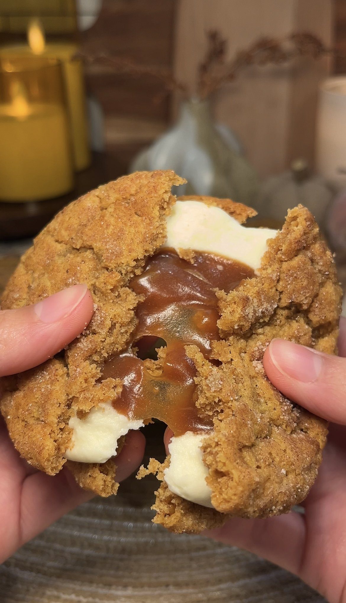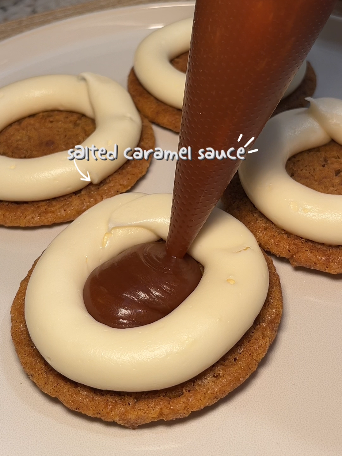 13. Fill your baked brown butter pumpkin snickerdoodle cookies with a ring of cream cheese frosting and then fill the center with salted caramel sauce.