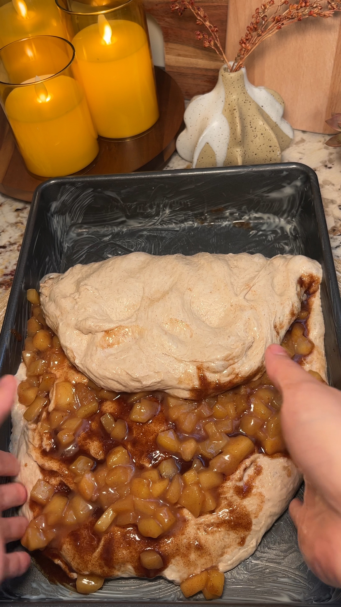The magic happens when you fold the dough like an envelope, creating those gooey apple pie layers. This technique traps all of that delicious cinnamon butter and sweet apple pie filling inside. After a second proofing, the bread is topped with even more of the buttery cinnamon mixture and apple filling, which are then gently dimpled into the dough with your fingertips. Once baked to a beautiful golden brown, the focaccia is finished with a final drizzle of cinnamon-sugar glaze, making every bite a perfect blend of fluffy bread, sweet cinnamon apples, and a crisp, sugary crust. It’s a sweet, comforting treat that’s perfect for any occasion.