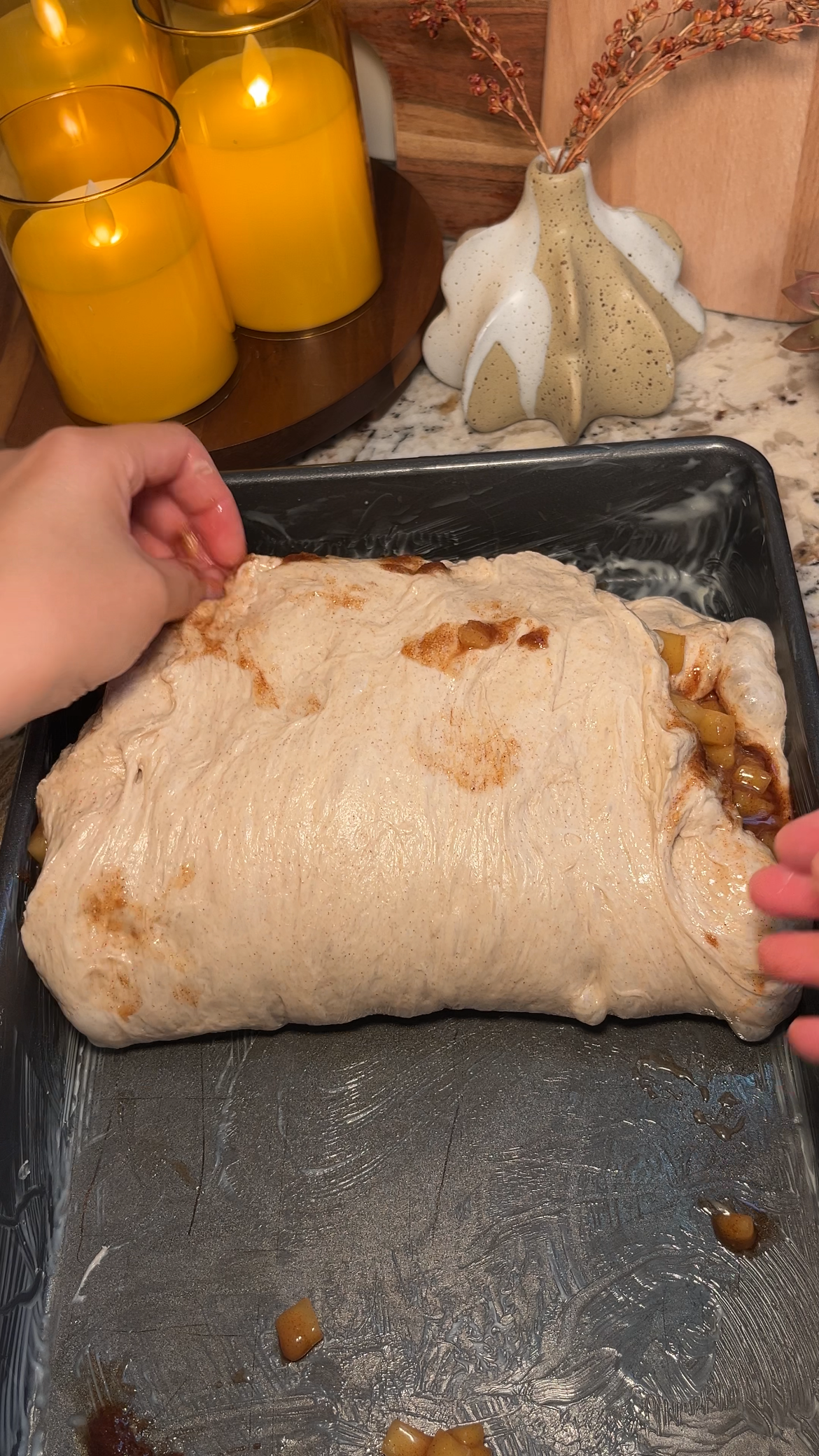 Gently spread HALF the cinnamon butter/sugar mixture and HALF of the apple pie filling on top of the dough.