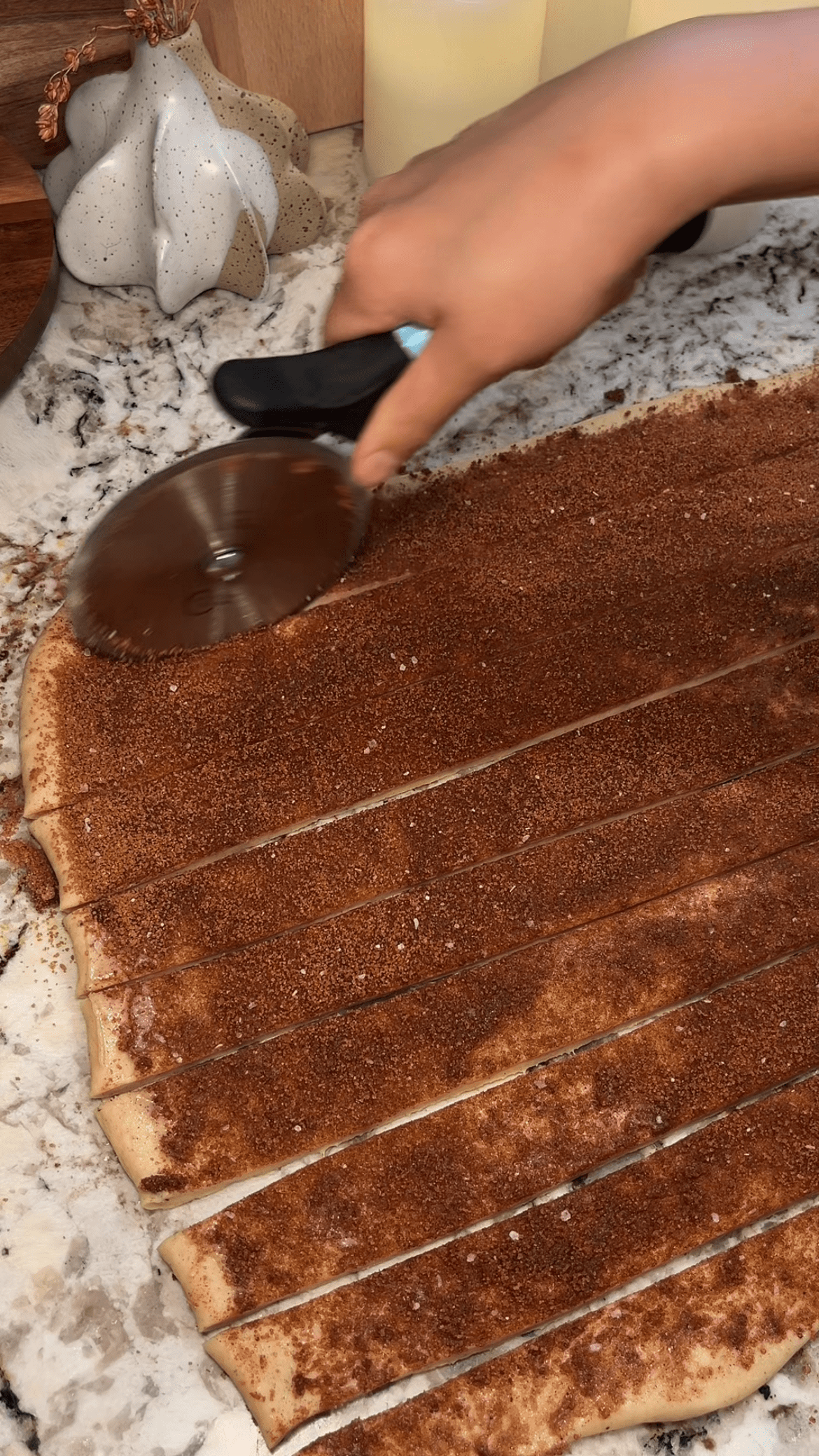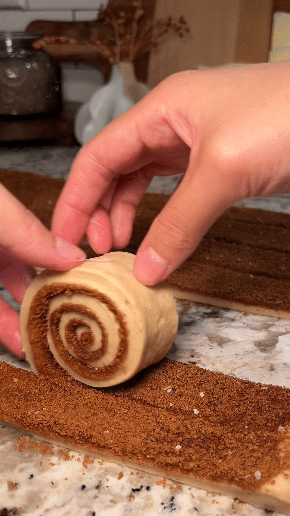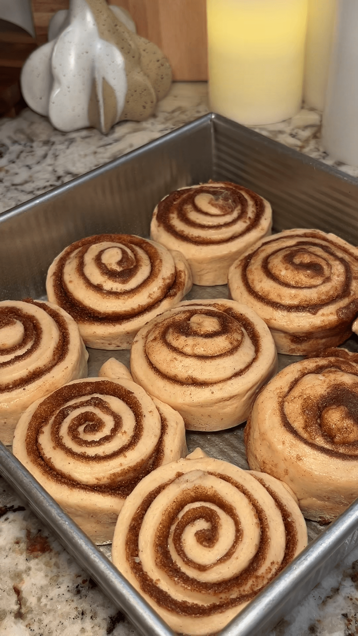 Roll each strip tightly into a cinnamon roll, and transfer to an 8×8 inch square baking pan.
