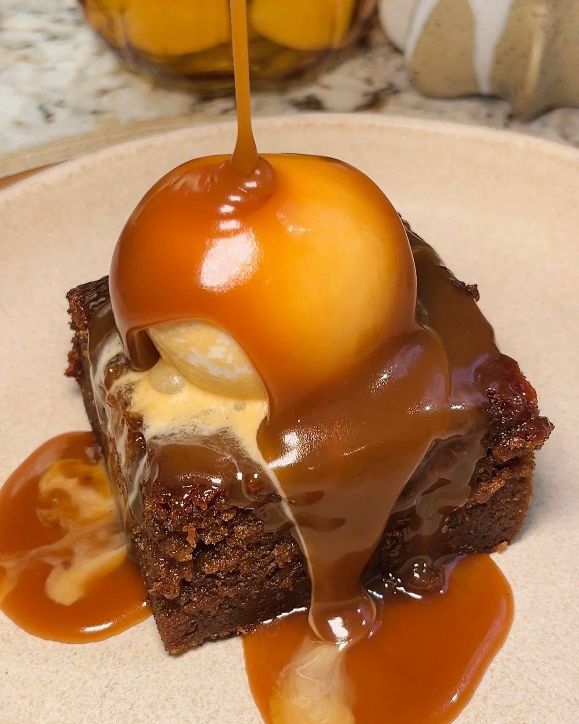 Top with a scoop of vanilla ice cream and drizzle with more of the coffee toffee sauce. Enjoy!
