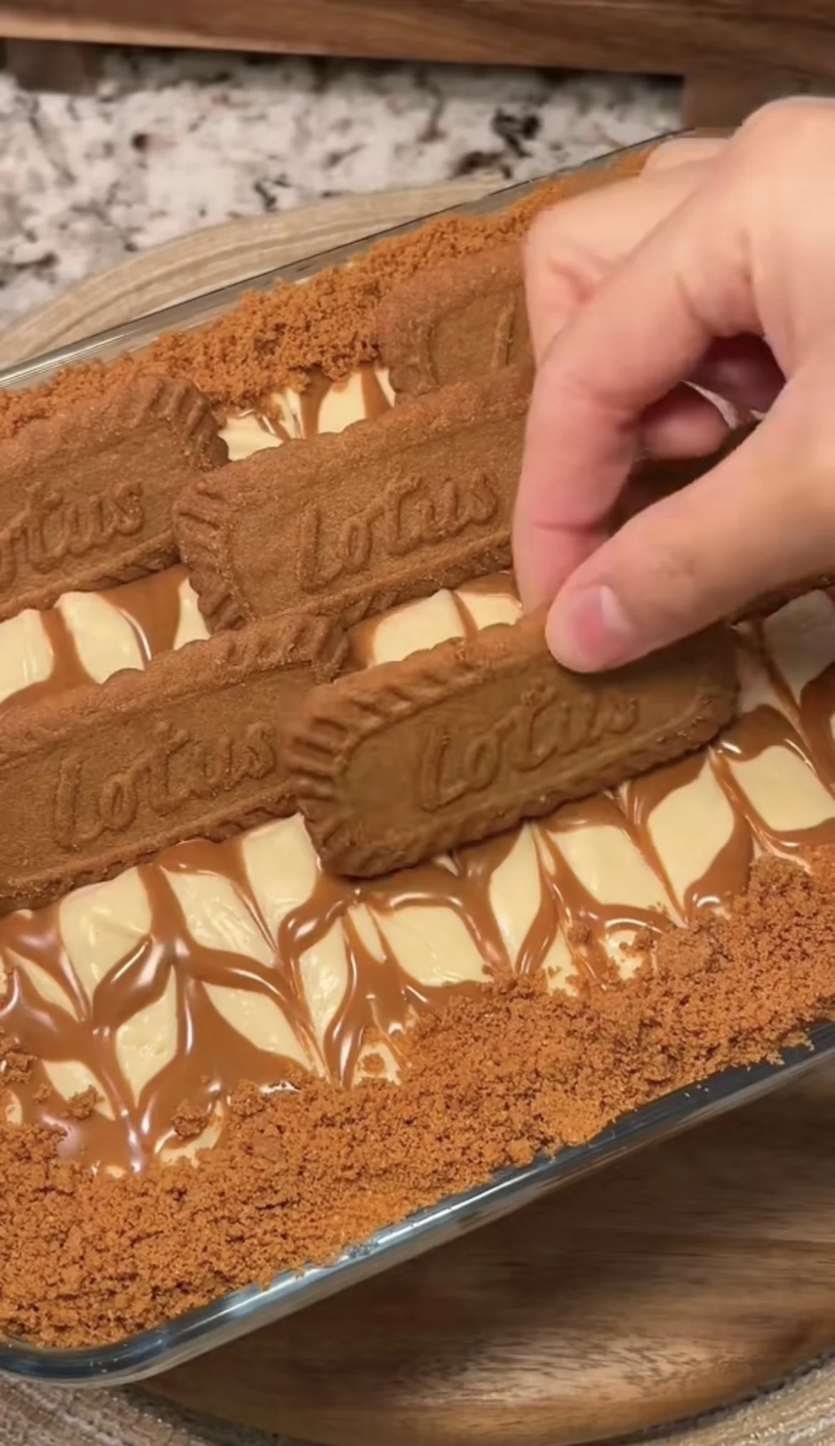 Decorate with vanilla wafers, Biscoff cookies, and crushed Biscoff cookies Ono stop if desired.