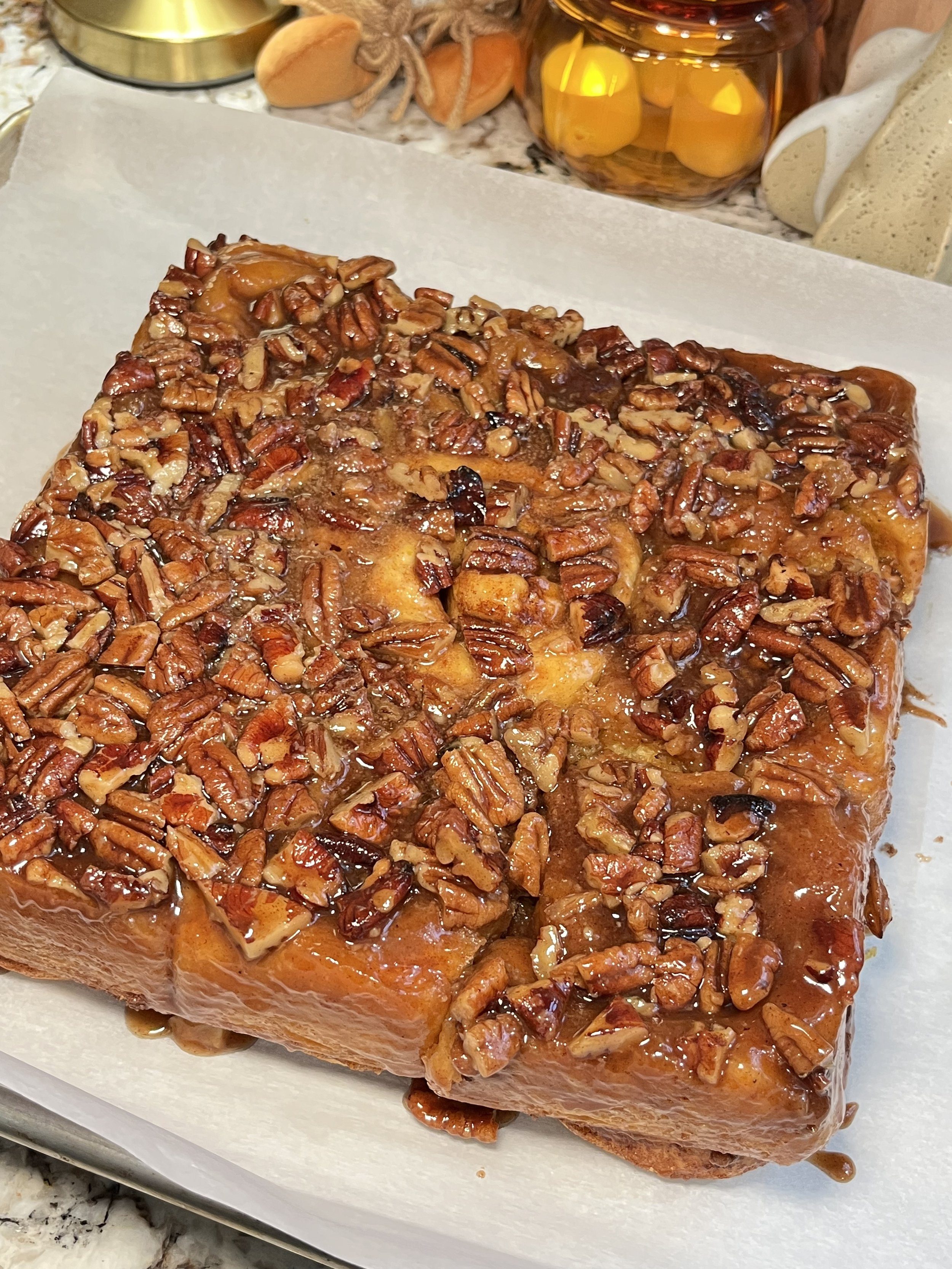 Remove the rolls from the oven and let them rest for 10 minutes. Flip the pan over onto a sheet stray lined with parchment paper (or a plate big enough to flip the rolls onto). Release the rolls from the pan to reveal a shiny coating of caramel pecan sauce all over your rolls.