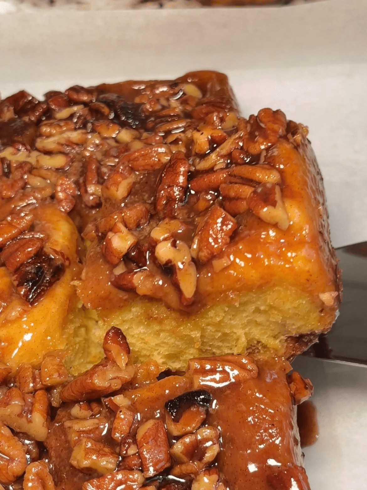 The real magic happens on the bottom (which becomes the top!) where a generous layer of melted butter, brown sugar, spices, and toasted pecans creates a magnificent caramel glaze. As the buns bake, the sugar melts and bubbles, seeping into every swirl of the soft pumpkin dough, resulting in a rich, amber caramel that’s truly irresistible. When these golden, spiraled treats come out of the oven, they’re immediately inverted, allowing the thick, gooey pecan topping to cascade over the fluffy, spiced pumpkin brioche. The combination of the melt-in-your-mouth brioche and the crunchy, buttery pecan caramel makes every bite a celebration of fall.