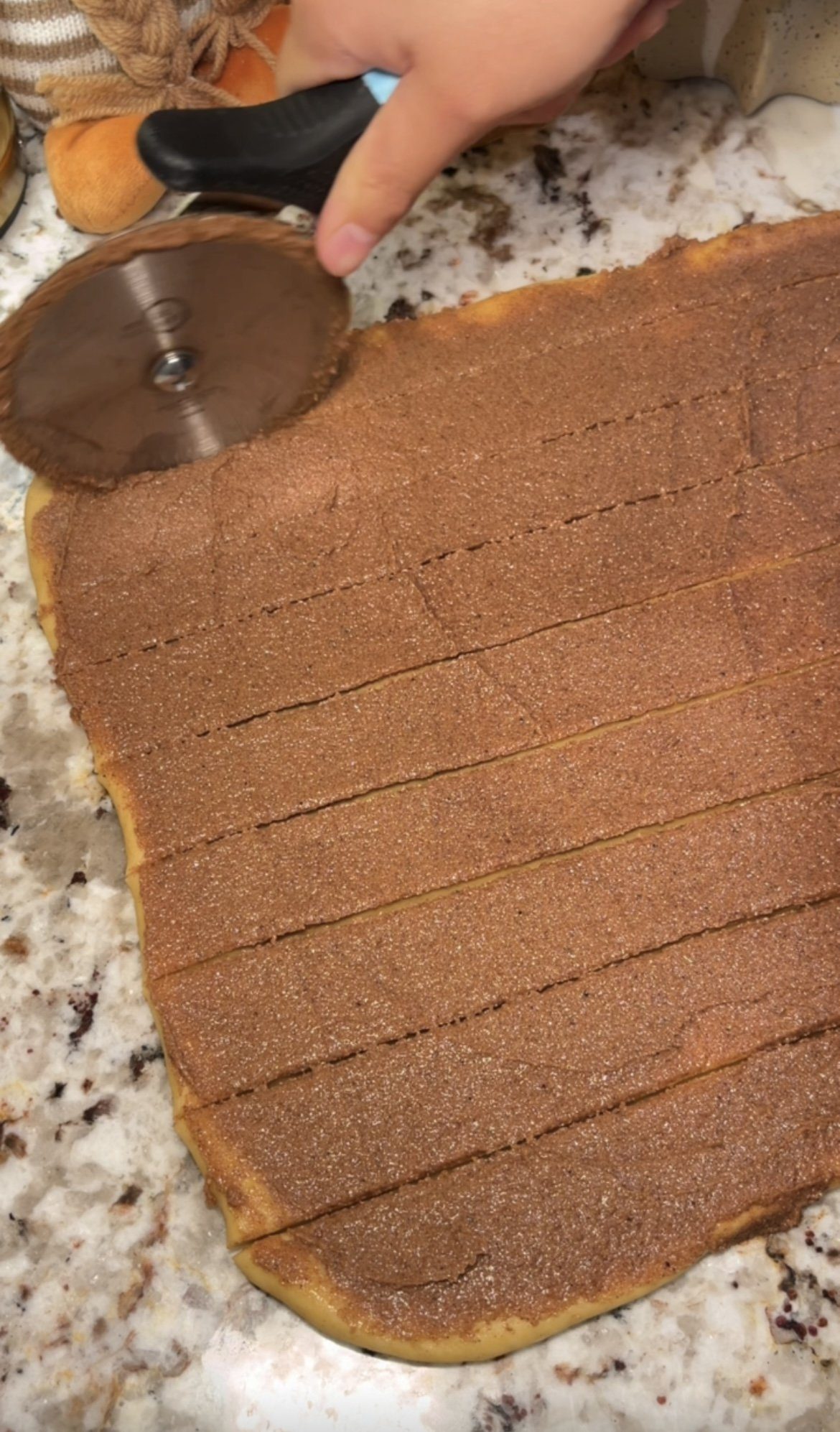 Cut into 9 even long strips. The strips should be 16 inches long and about 1.5 inch wide.