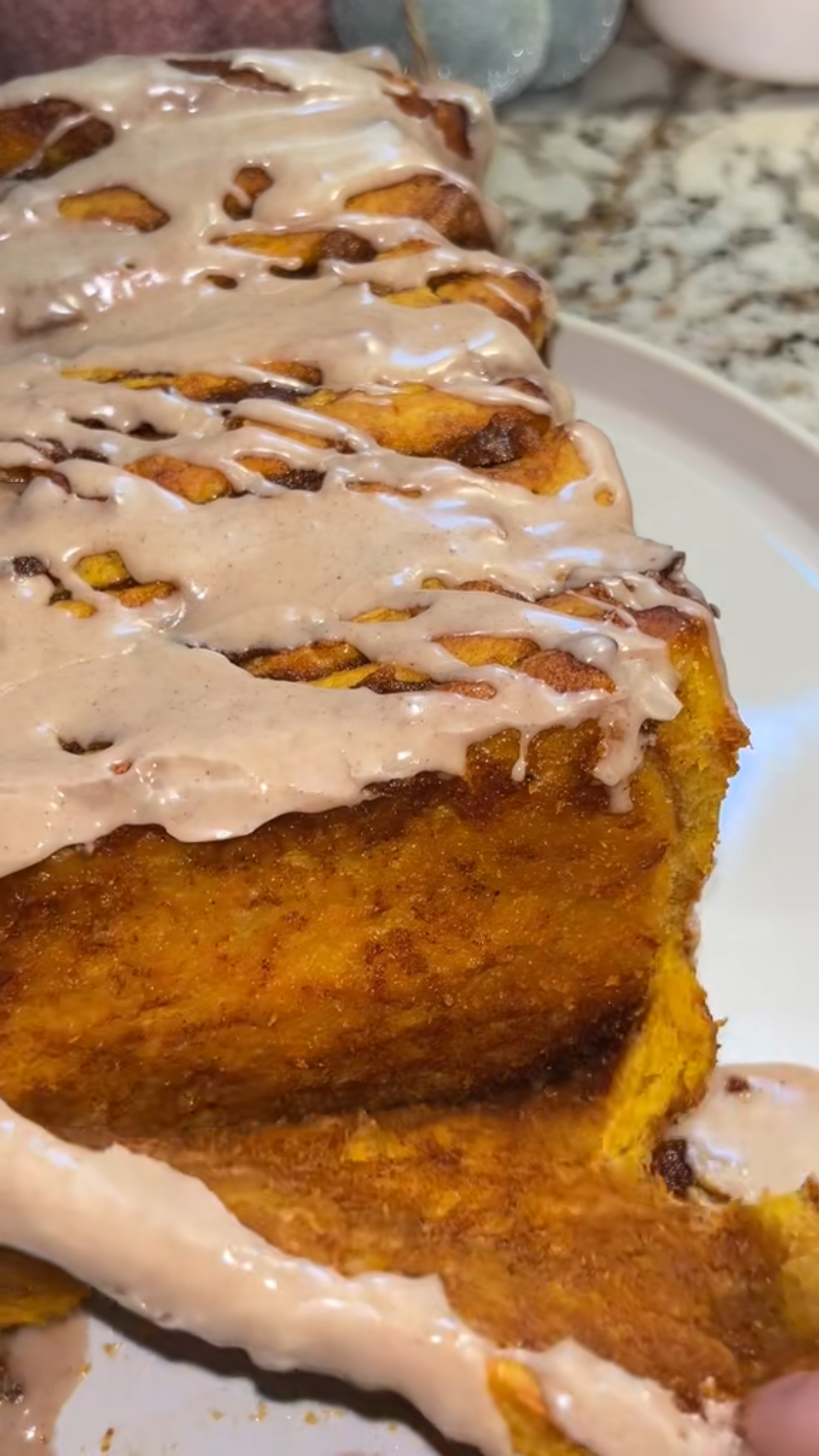 Once your bread has risen, bake at 350 degrees for 30 minutes or until golden. Cool loaf 10 minutes before removing from pan. Let cool completely before drizzling with the spiced maple glaze.