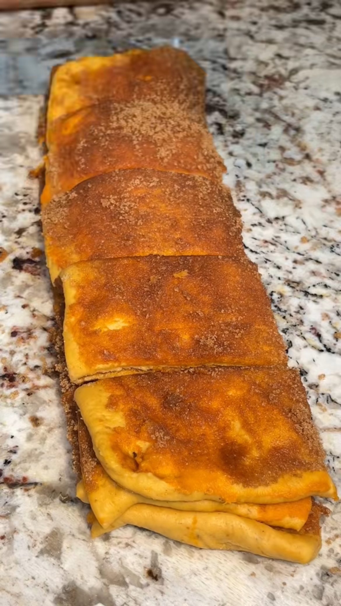 Then evenly spread the pumpkin/melted butter mixture over the dough then sprinkle with the cinnamon sugar mixture right on top of the pumpkin/butter mixture.