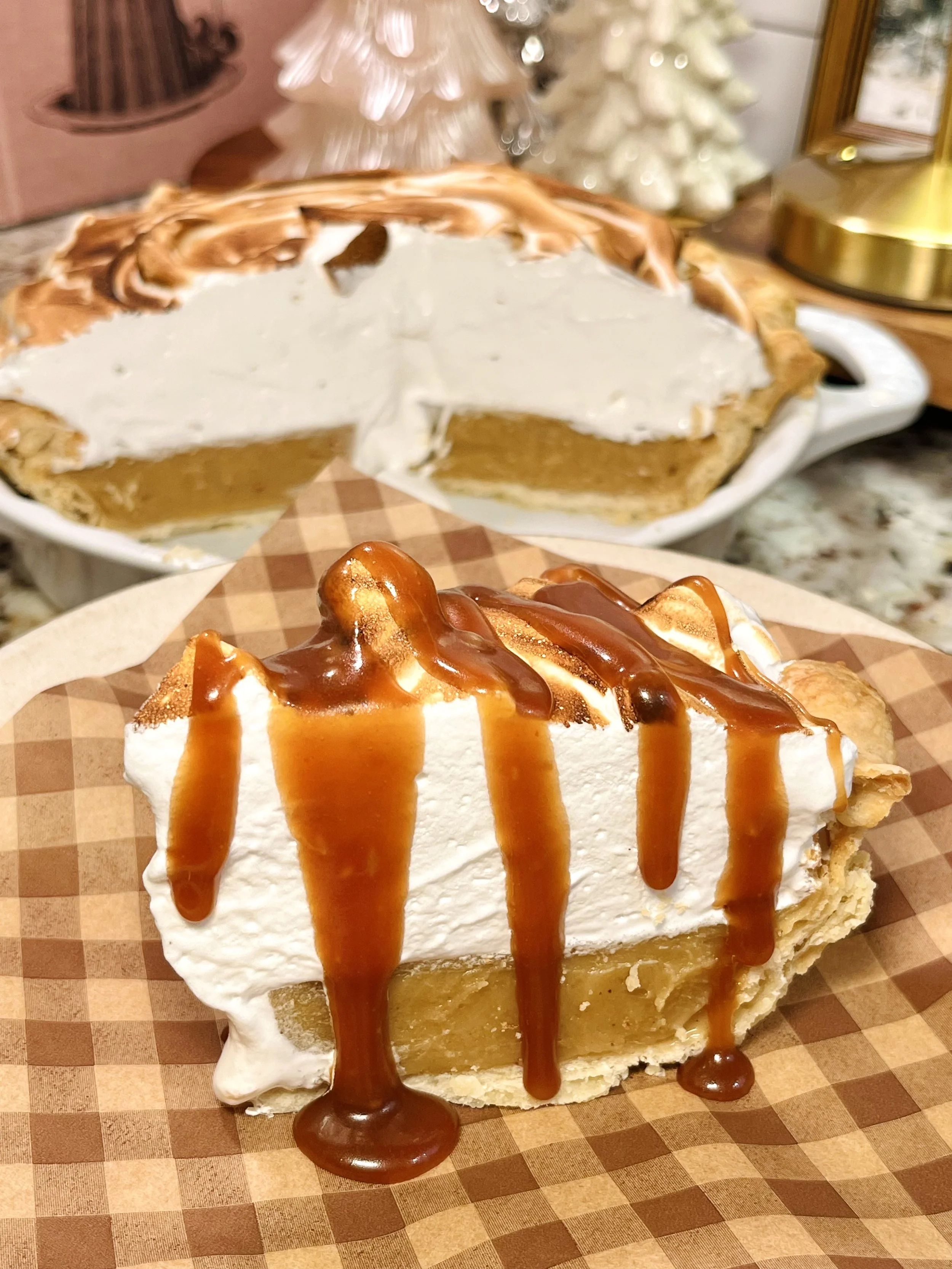 Meet the undisputed champion of comfort and class: Butterscotch Pie with Toasted French Meringue and a Drizzle of Salted Caramel!