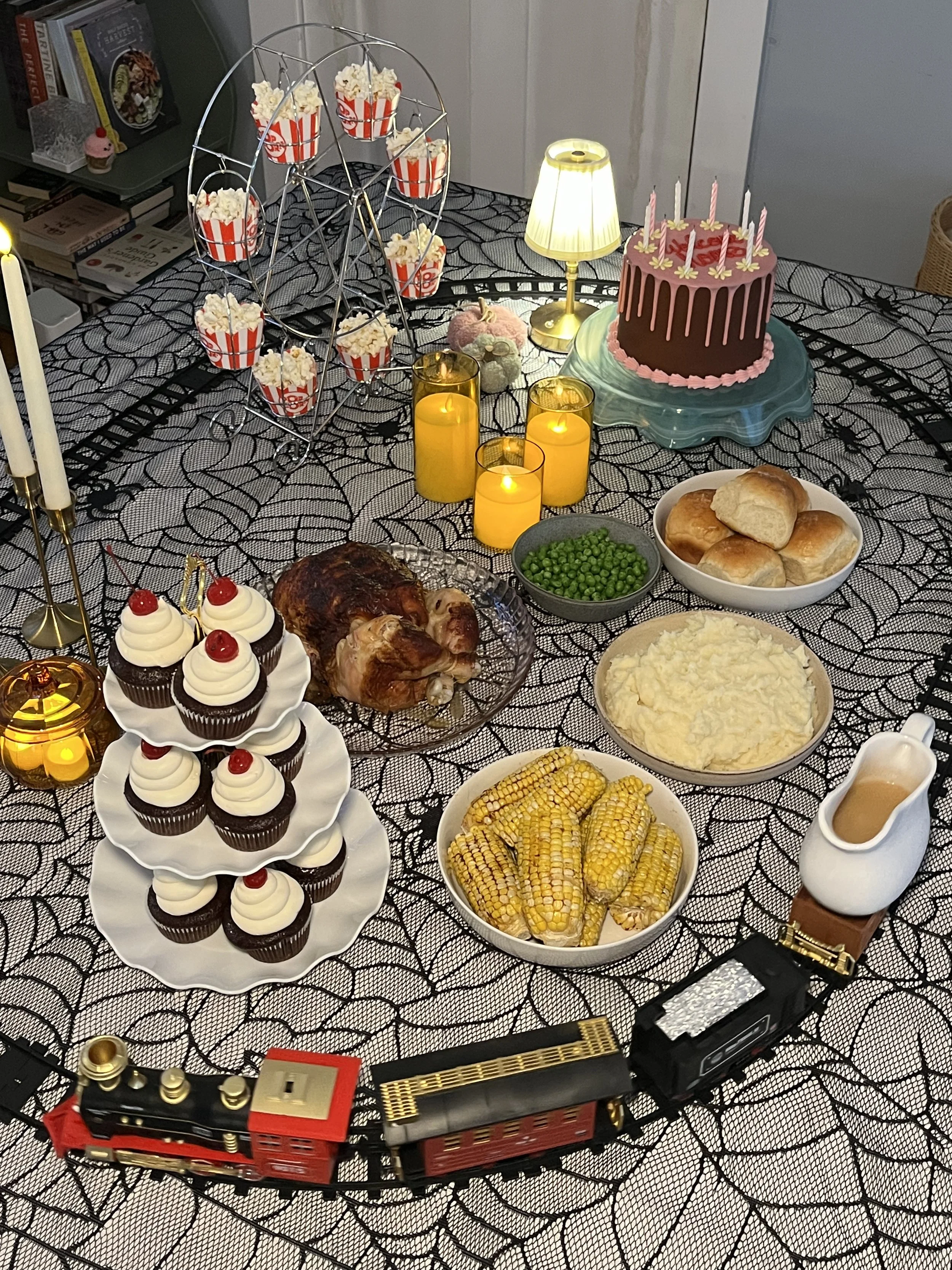 We placed a moving toy train set right down the center of the dining table. The trick here is containment: we set the food inside the circle of the track, turning the entire table into the dinner scene itself. The train ran on a simple loop, bringing that magical, manufactured perfection of the Other World right to our plates.